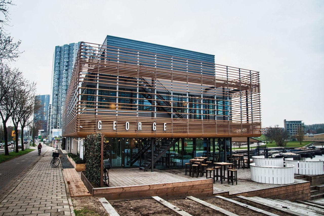 George Marina ligt in een bijzonder gebouw met drie verdiepingen, direct aan het water van de Amstel in het Amstelkwartier. Vanuit het restaurant kijk je uit op de jachthaven.