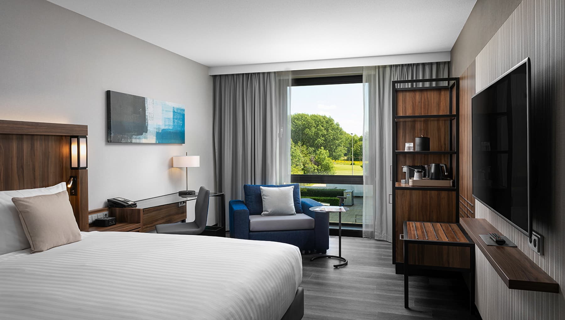 De kamers zijn voorzien van geluidsdichte ramen, luxe Marriott-bedden, een bureau, gratis Wi-Fi, een Smart TV met Chromecast, een privébadkamer, minibar, (laptop)kluis en mobiele check-in en check-out (voor Marriott Bonvoy-leden).
